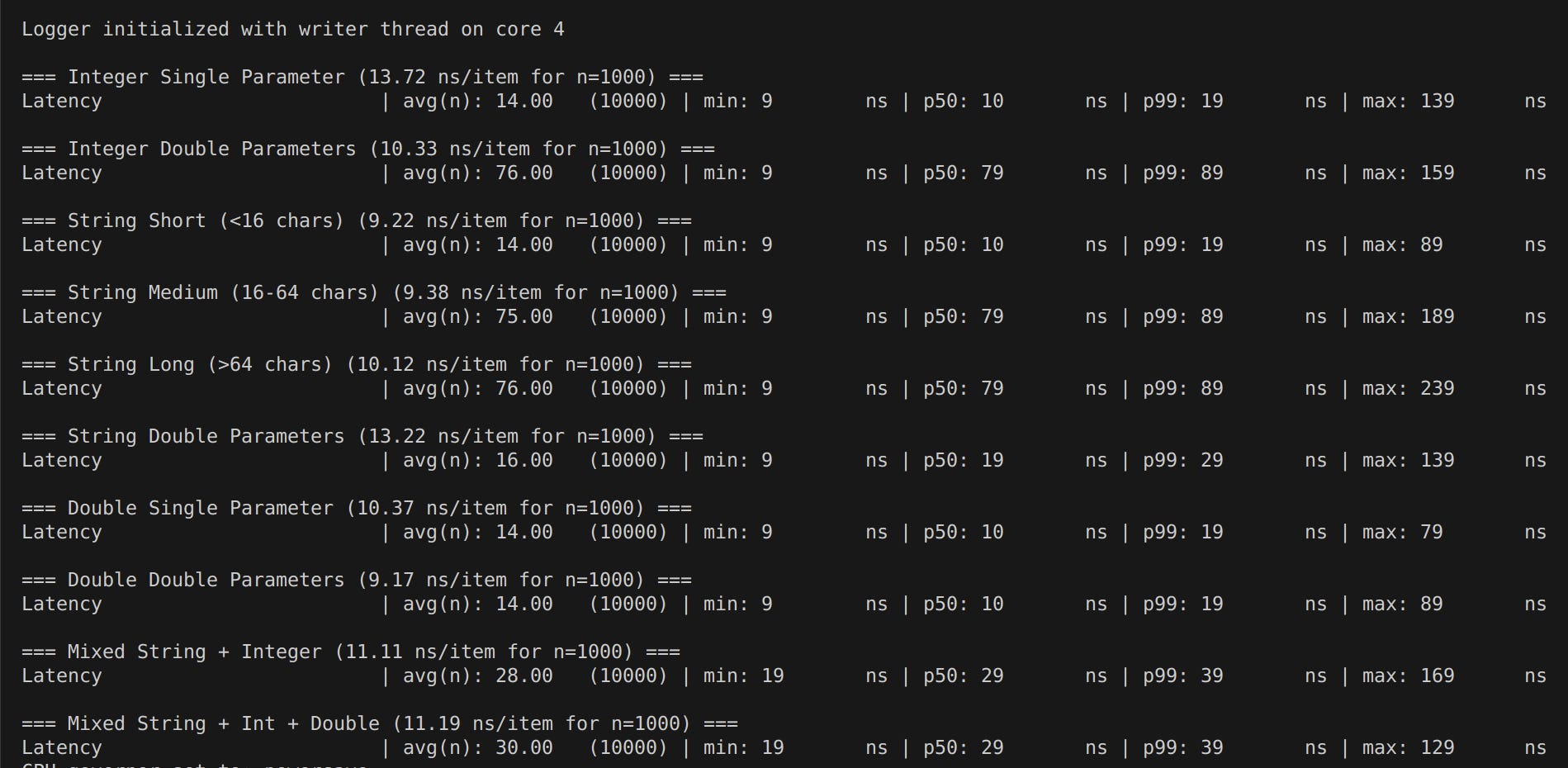 This reduces the runtime logic to just minimal memcpy of runtime data (large string logging with no parameters are zero-cost!) and one strlen call per-string argument, plus one lock-free synchronization for message handoff (and for all purposes, wait-free for sane logging rates).