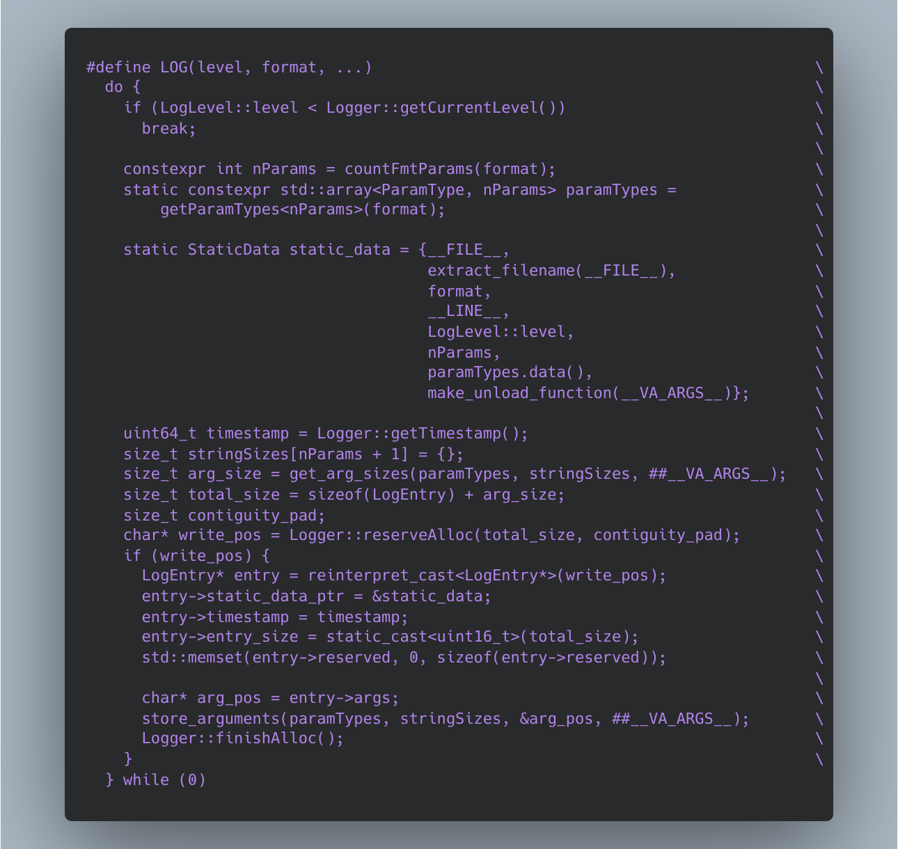 We are now a hop, skip and jump away from making a compile-time LOG ‘function’, note the quotes. Instead of LOG being a function, we define special macros such that the LOG statement expands into a code block with static variable initialization for static data.