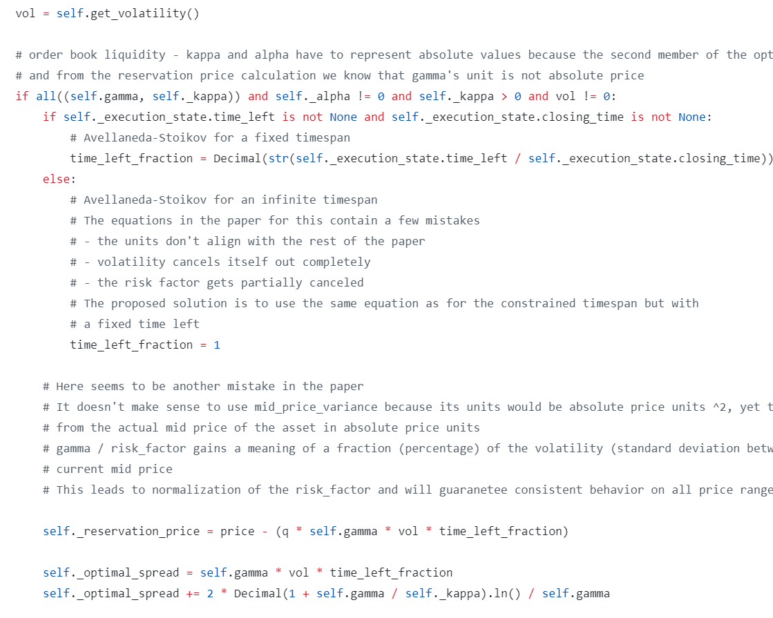 Here the deltas are just (quote - r) distances, and we can assume symmetrical. So the distance between ask limit price and bid limit price is just given by the RHS. The risk-aversion parameter shows up, and the kappa value is a measure of orderbook liquidity. I wrote about that here: