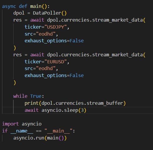 I have updated the datapoller library to work with eodhd, now featuring seamless and simple to use APIs for both market and fundamental data through REST APIs and websockets. Instead of having through go through confusing socket connection-subscription-authorization cycles and message buffer processing logic, we can write the simplest of logic…for instance: