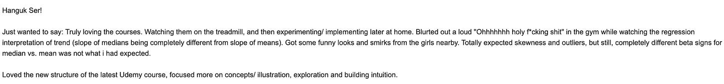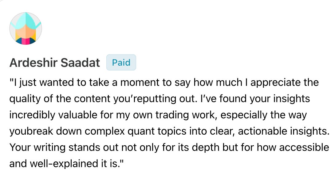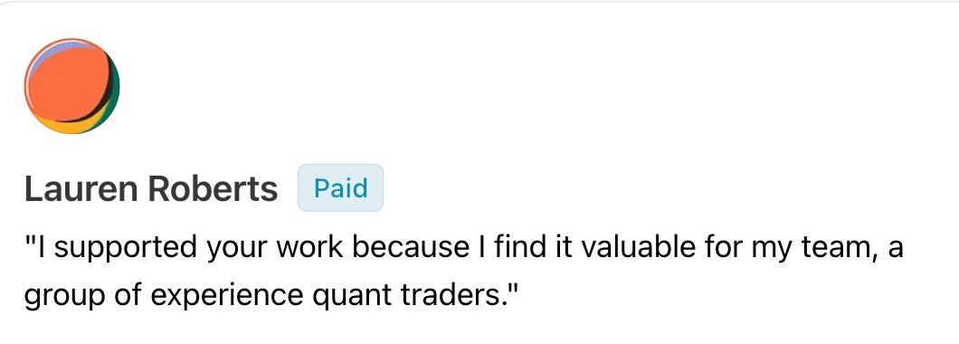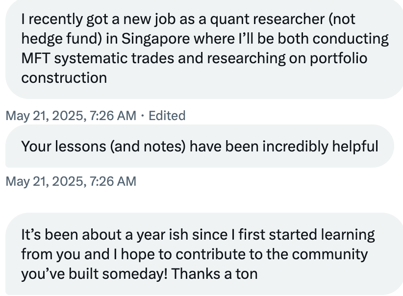 My mission is still the same - be the BEST platform out there for someone, say, with a inquisitive mind to learn the process of quant trading. At times, it means hard grinding notes, other times it is about keeping to date with cutting edge approaches, sometimes its about innovating approaches to finding arbs in adjacent markets, and others…managing risk and building infrastructures around plain, boring strategies that works. But…none of this means anything if you don’t put in the hours. The credit is not for me to take - it is your hard work that puts your right foot in front of the other.