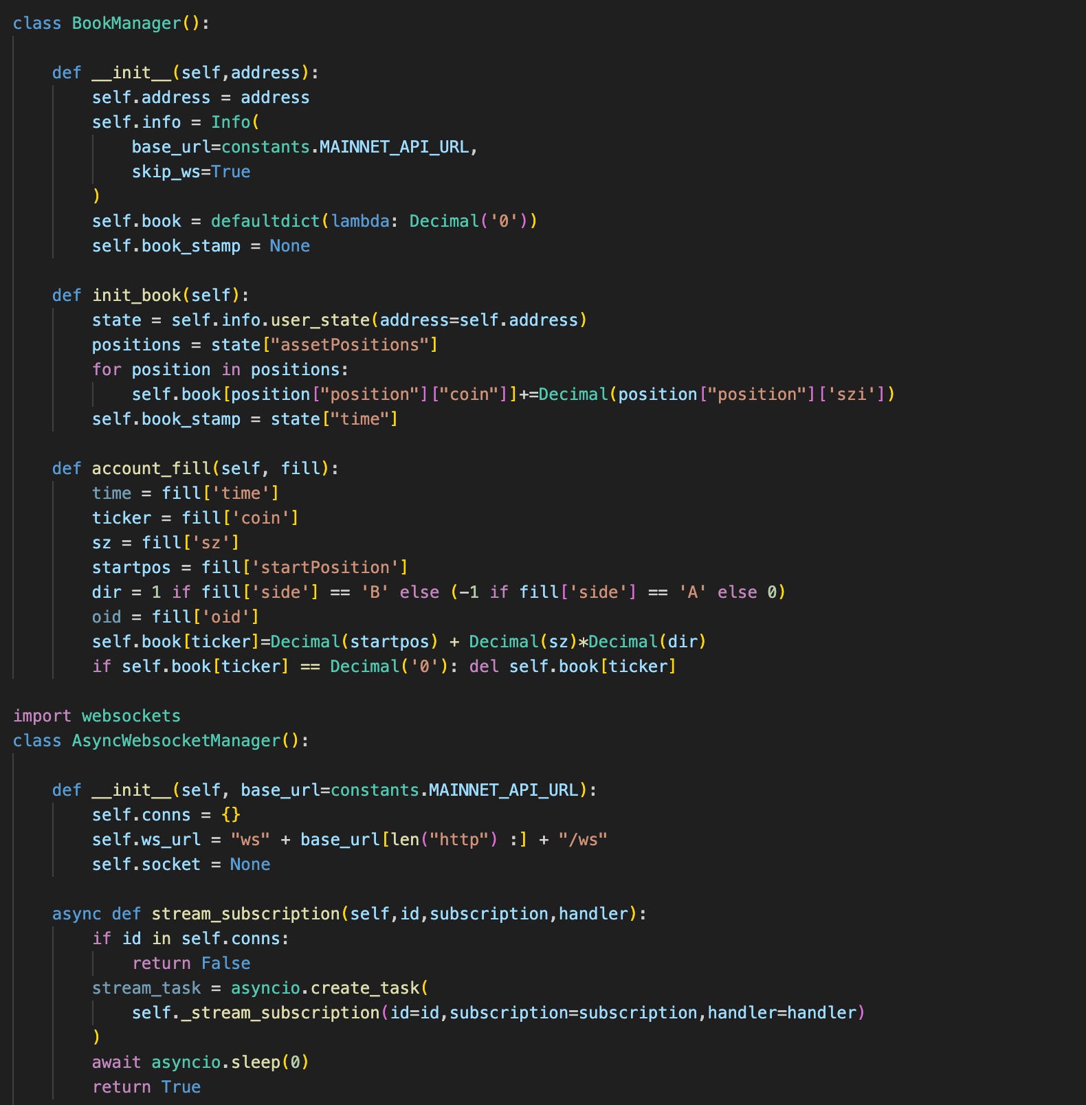 The official hyperliquid API currently supports threading for websocket streaming. For complete I/O bound tasks, this is not as resource efficient as an coroutine-based implementation (because coroutine-implementations are single-threaded).
