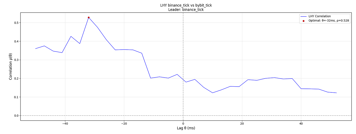 To motivate the post, we would like to obtain a plot like the following - showing peak correlation at lag of 32ms at bybit to the leader binance.
