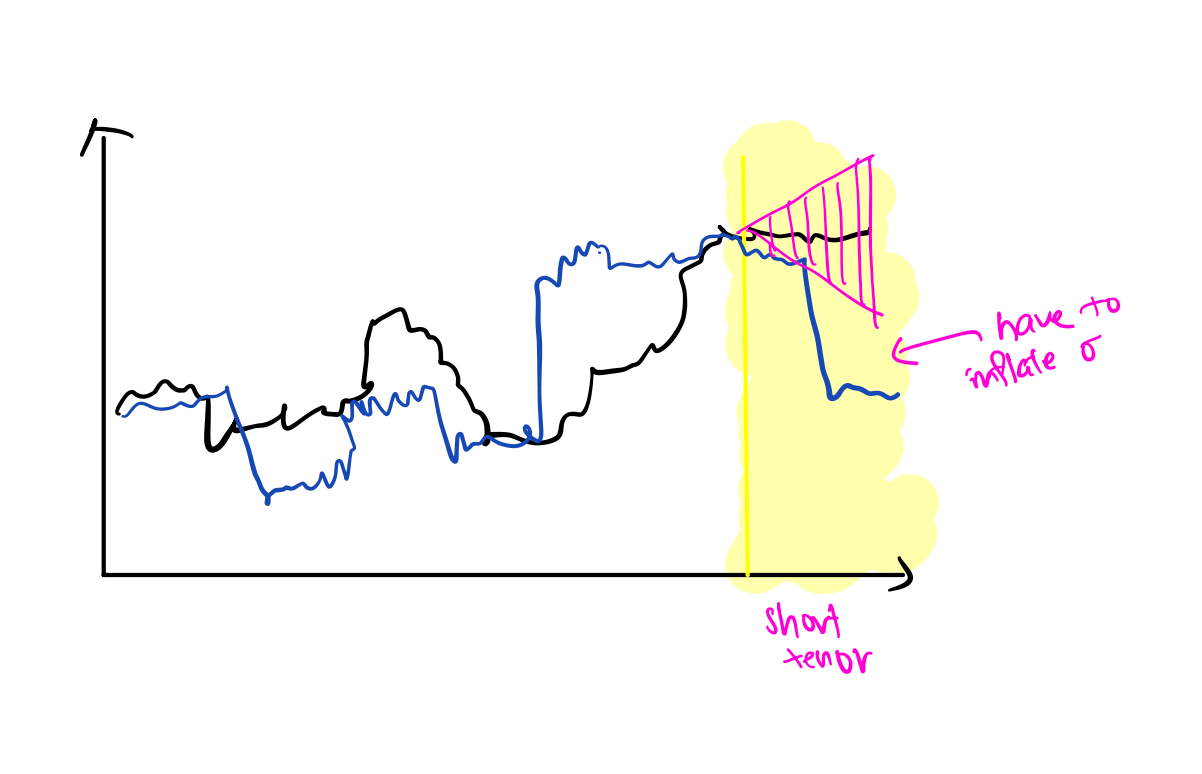 We will first begin by explaining why the jump awareness plays such an important role. Although it is possible in theory to build a volatility surface from more liquid markets, the extreme tte on these market’s suggest that there are very little nearby data points in terms of either strike or term structure; essentially backing out the parameter from a calibrated arbitrage free volatility surface requires extrapolation rather than interpolation, which is much more difficult and error prone from a statistical modelling perspective.