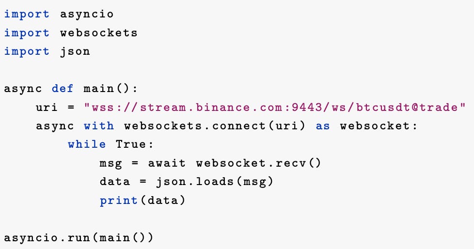 The line msg = await websocket.recv() enters a long-lived receive loop. On the network wire, Binance pushes trade messages as UTF-8 encoded JSON payloads framed into WebSocket text frames (opcode 0x1), layered over a TLS-encrypted TCP stream.