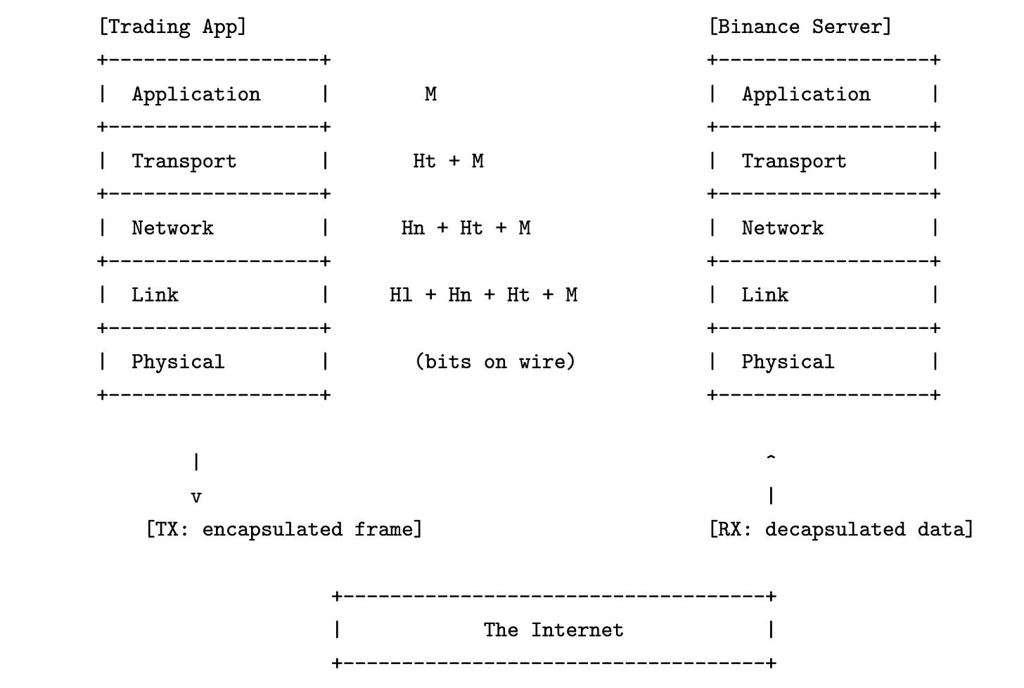 Layer 5: Application — Defines the meaning and format of messages exchanged between programs. Protocols at this layer include HTTP, WebSocket, FIX, and custom binary formats used in trading or data feeds. Application-layer protocols are implemented entirely in user space.