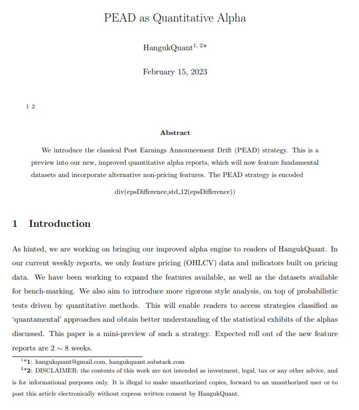 PEAD as Quantitative AlphaHangukQuantFeb 15, 2023∙ Paid52ShareNext post will cover the theoretical topic of investor Risk-Neutrality and Q measures.Paper, Paid Readers:This post is for paid subscribersSubscribeAlready a paid subscriber? Sign in