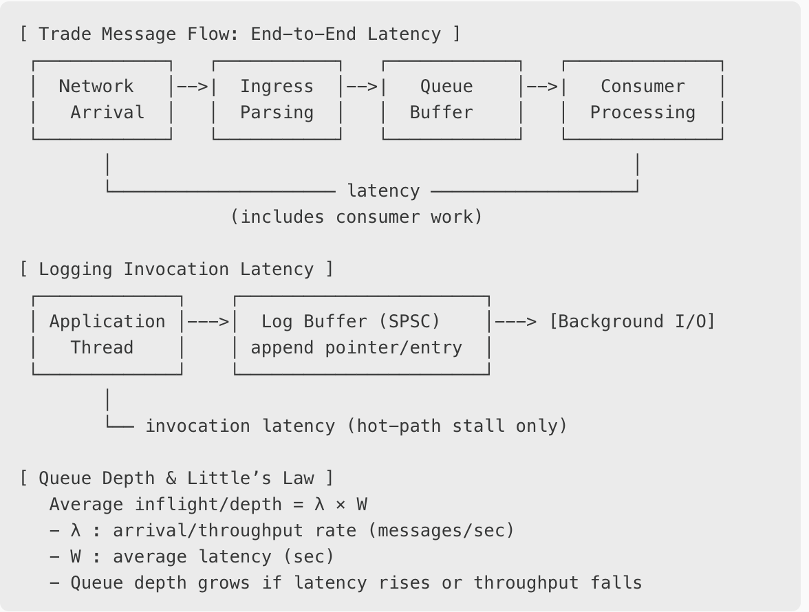 The primary figure of interest (on the system) is the end-to-end latency: the time from when a market data tick or trade message arrives on the wire until the consumer has fully processed it. This includes not just transport (time to be put on/off the queue) and queuing delay (time spent in the queue waiting to be consumed), but also the consumer’s own work.