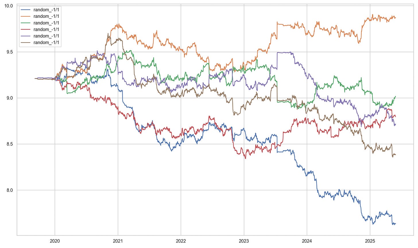 ]The strategies correspond to trading on the time-series k day z-scores, k logarithmic returns and moving average pairs. The random strategies correspond to random voting machines.